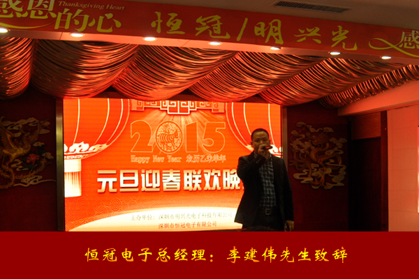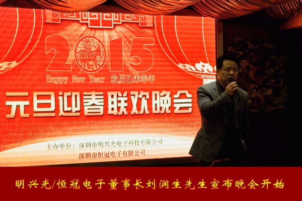 2014年12月31日晚18:15分,明興光元旦聯(lián)歡晚會在石巖街道旺閣漁村隆重舉行,明興光、恒冠電子企業(yè)領(lǐng)導(dǎo)以及全體職員近200人參加了晚會。