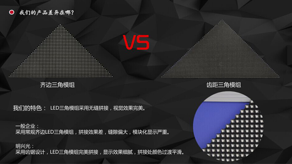 采用齒鋸設(shè)計(jì),LED三角模組完美拼接,顯示效果細(xì)膩,拼接處顏色過渡平滑。